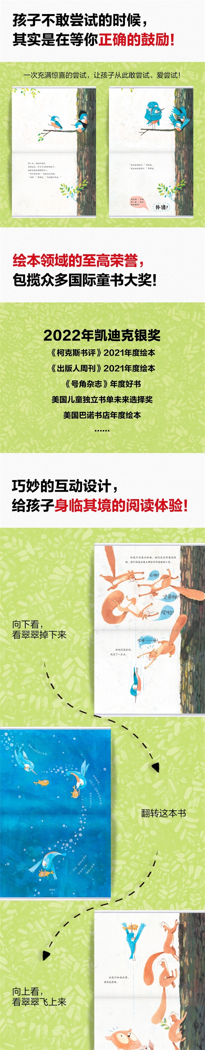 这是一本荣获绘本领域的至高荣誉——凯迪克大奖,包揽众多国际童书大奖的绘本!绘本通过巧妙的互动设计,独特的阅读方式,给孩子身临其境的阅读体验!告诉我们:孩子不敢尝试的时候,其实是在等你正确的鼓励!小翠鸟一次充满惊喜的试飞,让孩子从此敢尝试、爱尝试!读到一半时一定要翻转这本书,体验勇敢尝试的无穷乐趣!