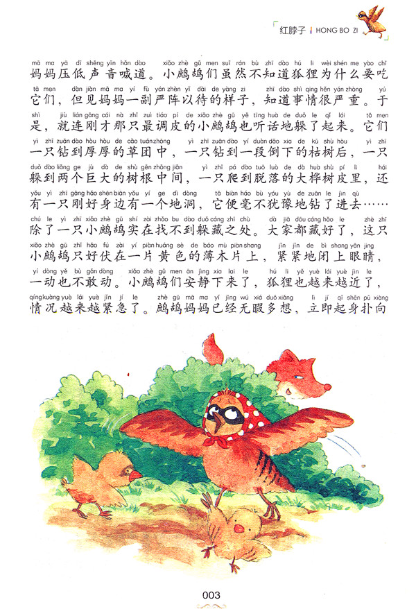 《红脖子(标准注音彩绘版)/世界经典名著系列/爱阅读童年彩书坊》这个故事讲述了一只雄壮而美丽的鹧鸪如何在困境中努力求生。从中我们发现由于掠夺性的资源开发与野蛮的生产方式使地球上的物种正在迅速减少,许多动物濒临灭绝,生态系统遭到了严重破坏。因此我们要努力修复生态系统,建设绿色家园,这也是西顿动物小说的精髓所在。本书是为小学生特别设计的缩写本,为了更有效地提高小学生的阅读和写作能力,编者在正文加注了拼音,并用特殊彩色字体突显好词,再加上精致的动物插图,为小学生展现了一个逼真精彩的动物天地