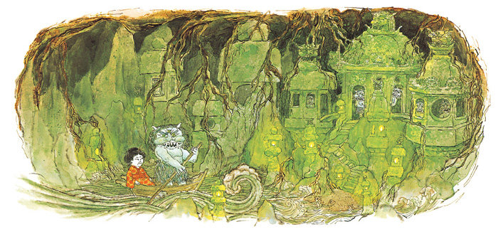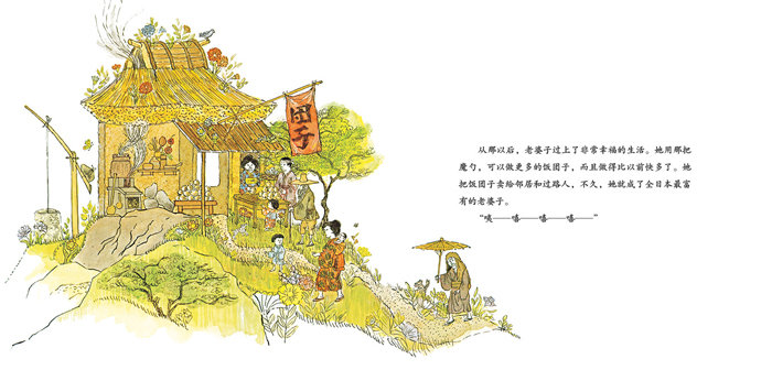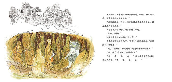 改编自小泉八云整理的日本民间故事,图画带有浓郁的日本民间文化色彩,对地洞世界里的菩萨和恶鬼的描绘都非常传神。图画运用双线并行的叙事手法来讲故事,通过色彩与构图的变化推动故事情节,最后双线合并为一个圆满的结局,构思巧妙,非常耐读。