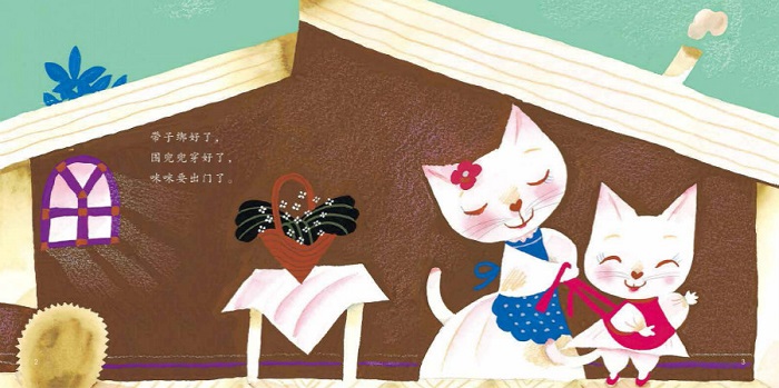 咪咪要去外婆家,妈妈给她穿上了新的围兜兜,打了一个漂亮的蝴蝶结。
