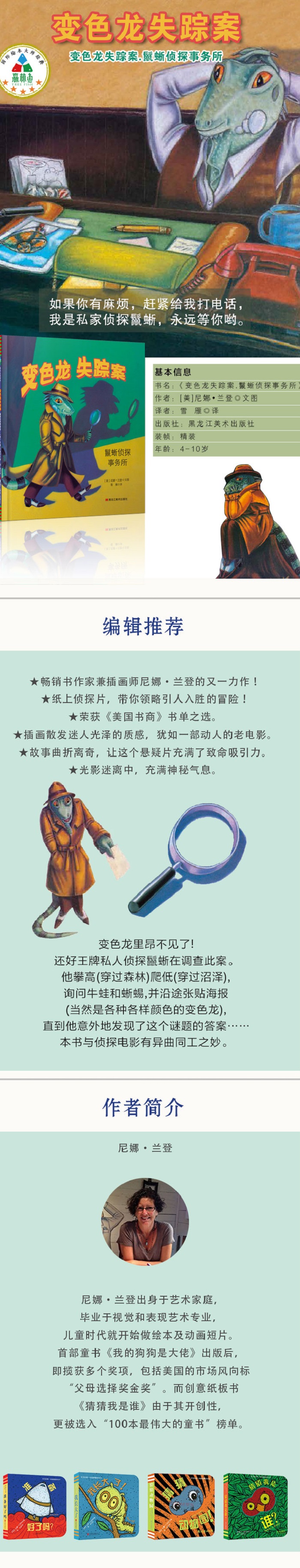 这本了不起的小书,充满了色彩鲜艳的插图和大量的双关语(口头的和视觉的,有些是真正的笑话)。侦探电影里一个友好狡黠的眨眼、美丽客户的絮絮叨叨、迷人的夜总会歌手、失踪的丈夫和具有鬣蜥先生独特风格的毛呢帽子和腰带式风衣……这些对小读者无不是一种完美开场,对父母也是一种享受。