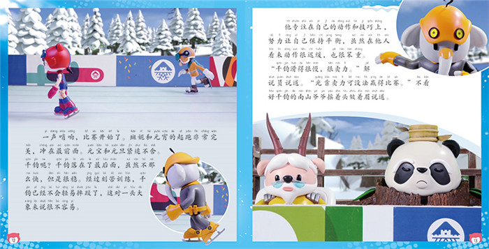《冰雪冬奥村超越自我拼音认读故事书》系列共6册,改编自北京卡酷传媒有限公司设计制作的动画片《冰雪冬奥村》。书中由金钱豹、藏羚羊、大熊猫等可爱动物变身而成的萌趣角色,共同演绎冰雪运动的魅力,讲述与冬奥有关的故事,向少年儿童传递办奥理念、弘扬奥运精神。 《速滑逆袭》一册包含两个故事——《速滑逆袭》和《我们是队友》。斑妮和长臂猿三兄弟决定来一次短道速滑比赛,他们也邀请千钧参加,因为他们知道,垫底的一定会是大象千钧,没有一丝希望的千钧能否完成逆袭呢?冬奥村举行了速度滑冰集体出发赛,“行动派”斑妮和“计划派”脆皮却不能好好配合,他们还能赢得比赛吗?故事之后,还有专门的冬奥知识页,介绍“短道速滑”和“速度滑冰集体出发”。