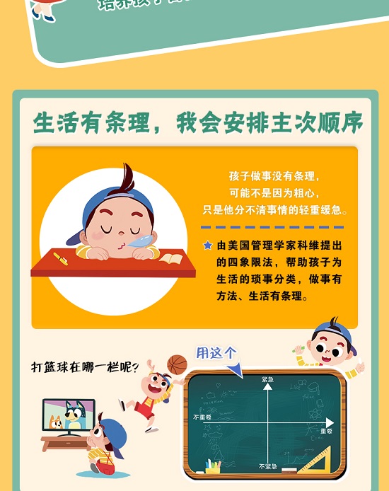 本书旨在培养孩子时间管理能力,帮助孩子合理安排一天的工作计划,内容上,分别从认识时间、感受时间、时间规划(早晨时间规划、课余时间规划、周末时间规划、出行时间规划、假期时间规划)和时间的意义几个方面,让孩子学会时间的认读、树立时间观念,从小培养主动管理时间的意识。 书中运用简单的图表,为孩子介绍了多种时间管理方法,有饼状图法、四象限法、金字塔法,还有时间小存折。让孩子在动手的同时学会时间管理。 虽然学会时间管理并不能直接提高考试成绩,但是却时刻影响着孩子的学习、生活,甚至影响着一个家庭的亲子关系,因此,尽早教会孩子自我管理,让他们能独立安排自己的时间,完成自己的任务,变得尤为重要。