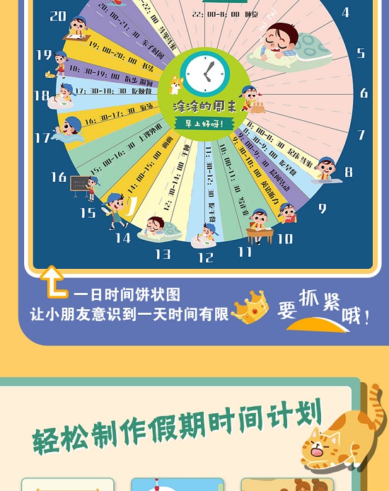 ※封面设计指针可旋转的多层数字表盘,降低认知难度,保护孩子的积极性; ※时间存折让孩子意识到“时间都是自己的”,帮助孩子主动进行时间管理,提高内驱力; ※利用美国管理学家科维的四象限法,帮助孩子梳理生活琐事,培养生活条理性; ※饼状图、金字塔等超实用小方法,让孩子在趣味小互动中,为自己做好时间规划; ※通过实际场景演练,加入时间统筹规划概念,让时间管理深入到孩子的生活之中; ※约80个互动翻翻、转盘、插卡,增加阅读趣味,在游戏中学习知识; ※大量互动板块,增加孩子参与感和仪式感,具有超强实用性; ※真正从孩子的视角出发,不说教,让孩子自己管理自己,杜绝逆反心理; ※时差、地球自转公转、人类和植物进化史,超丰富的百科知识,帮助孩子全方位理解时间。