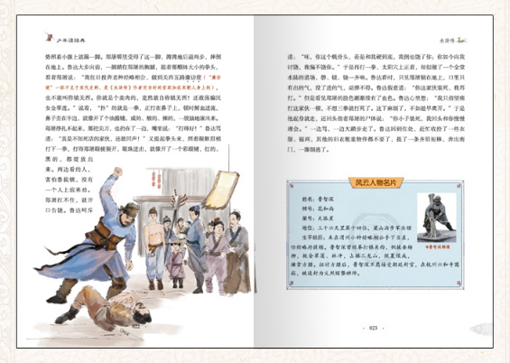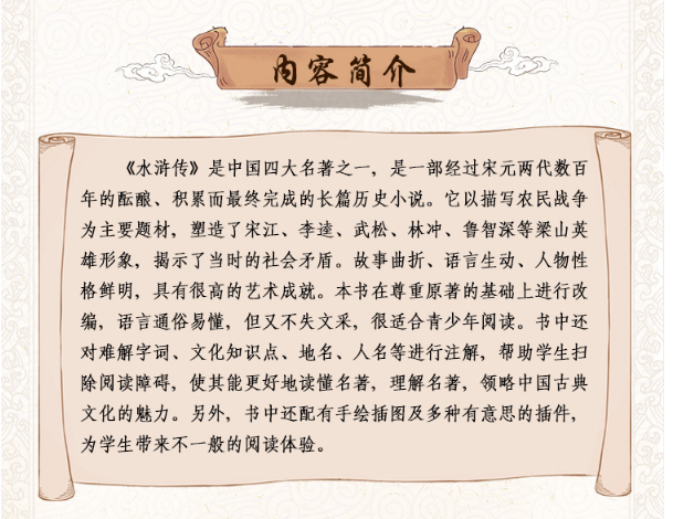 《水浒传》是我国*早的长篇小说之一,也是*部描写农民起义的小说。全书围绕“官逼民反”这一线索展开情节,描写了一百零八位英雄好汉被逼上梁山,队伍逐渐壮大,起义造反到*后接受招安的全过程。小说成功地塑造了宋江、林冲、李逵、鲁智深、武松等鲜明的人物形象,也向读者展示了宋代的政治与社会状况。本书针对青少年的阅读习惯对《水浒传》中的故事进行改编,用简单又不失趣味的语言将故事呈现给读者。文中采取夹注的形式,对文中难以理解的字词或文学、地理常识进行解释,使学生真正地实现无障碍阅读,更好地理解作品内容。