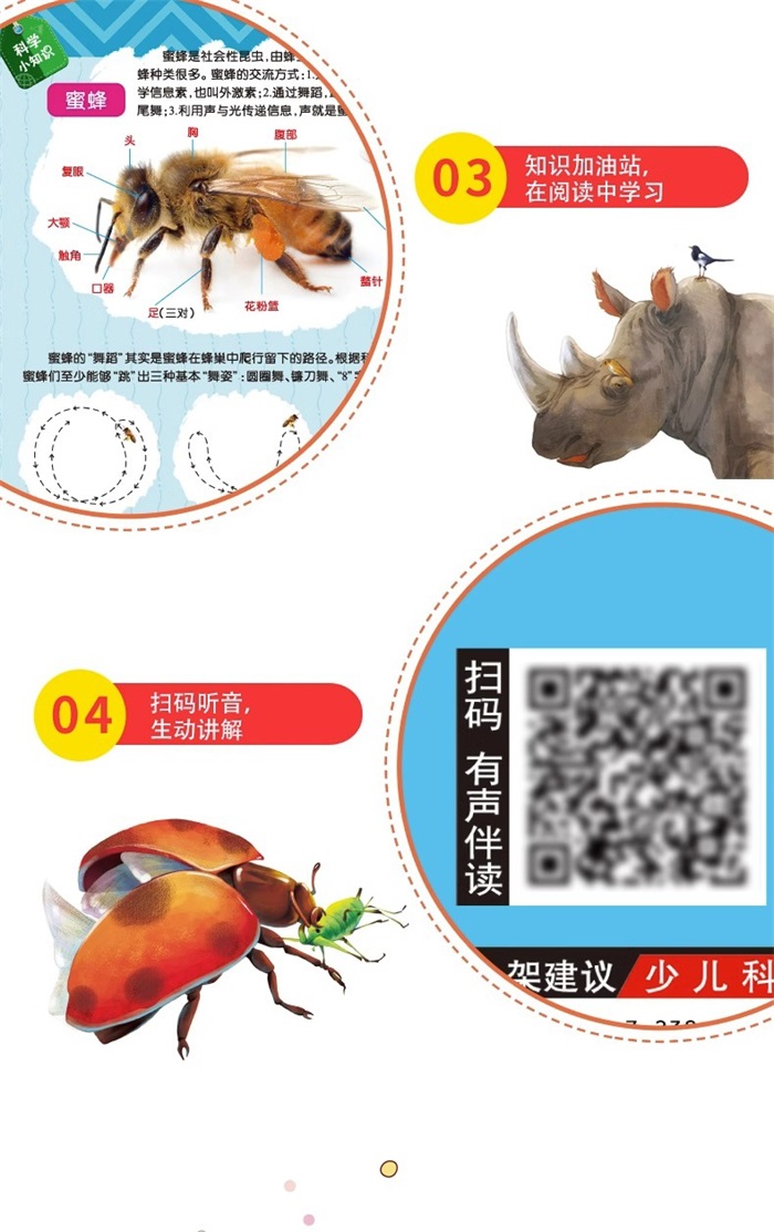 《会跳舞的小蜜蜂》 蜜蜂也会跳舞吗? 一一蜜蜂的舞蹈其实是莫风在蜂巢中爬行留下的路径。根据科学家的研究表明,蜜蜂们至少能够跳出三种基本舞姿:圆圈舞、镰刀舞、"8"字舞。