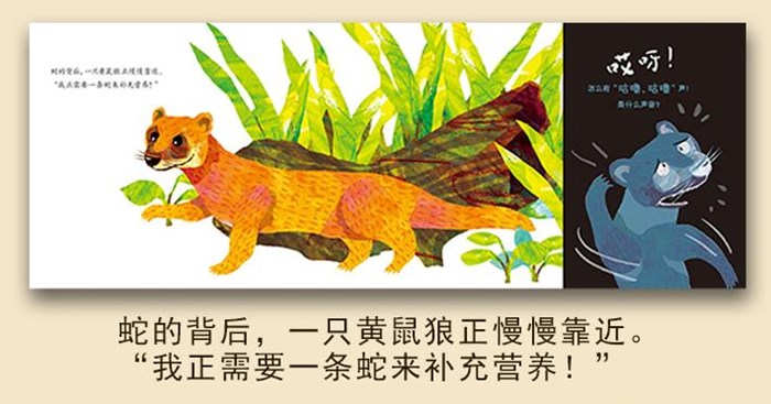 《果子红了》通过描述一颗石榴熟了以后引发的食物链大作战,以极具故事性的夸张手法展现各个链条上动物心理状态的转变,带领小读者们开启一段食物们的森林冒险之旅。为小读者普及食物链科普知识的同时,也将人与自然和谐相处的人文理念蕴藏其中。文本的节奏和韵律感很强,文中重复出现的“哎呀”,让小读者在阅读中体验发音的乐趣。