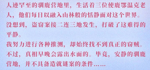 在中国北方大兴安岭的莽莽林海之中,生活着饲养驯鹿的鄂温克人,他们的驯鹿营地就在密林深处。他们饲养的驯鹿,和栖息在丛林中的熊、狼獾、犭罕、雕鸮、游隼、榛鸡、花鼠……时时上演着一个个野性、神秘、动人的故事。 人迹罕到的驯鹿营地里,生活着三位使鹿鄂温克老人,他们每日以融入山林般的恬静面对这个世界。没想到,盗窃案接二连三地发生,打破了这难得的平静。我的相机备用电池也不见了。周围的世界里满是稍纵即逝的美景,而我却无法将这一切记录下来。我努力进行各种推测,却始终找不到真正的窃贼。不过,真相早晚会露出水面的。毕竟,安静的驯鹿营地,并不具备造就谜案的条件……