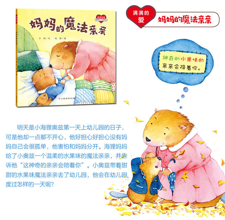 “满满的爱”安全感系列绘本共有8个分册,分别是:《妈妈的魔法亲亲》《爸爸的魔力抱抱》《妈妈上班时会想我吗》《爸爸上班时会想我吗》《我好喜欢妈妈》《我好喜欢爸爸》《一会儿是多久》《爸爸不见了》。这是一套帮助孩子建立安全感的绘本,选择了8个在生活中很有代表性的主题,旨在帮助孩子缓解由于分离而引起的较大的离别情绪反应——分离焦虑,引导孩子学会正确、良好地控制自我情绪,建立充足的安全感。在亲子共读时,爸爸、妈妈和孩子可以一起学习、一起成长,一起感受到满满的爱!儿童心理专家和知名童书作家倾情推荐。