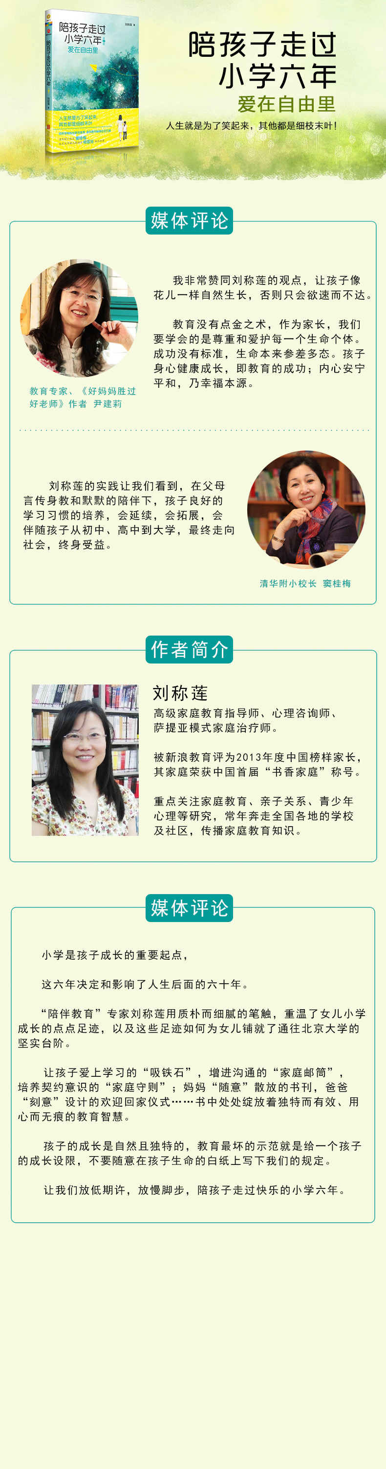 什么是教育?刘称莲给了我们一个很好的诠释,教育就是陪伴。在若辰顺利的成长之路上,我看到的不是一个人的足迹,而是一家三口并肩行走的背影。翻开《陪孩子走过 小学六年》,读懂另一种教育。