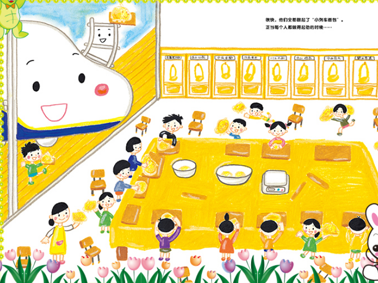 明天要和幼儿园的小朋友们一起做面包,小列车决心要做出一个大、好看的面包来!但是,他没有手,怎么捏面团呢……