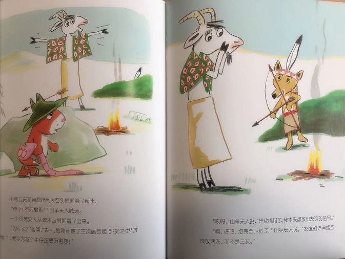 本书为儿童绘本,讲的是比利和吉恩去寻找印第安人的故事。他们路上遇到了山羊夫人,帮他们一起放烟雾信号给印第安人,结果弄错了信号,将求救的信号误当作友谊的信号发了出去,所以一个印第安人过来之后冲他们放箭射中了比利的帽子,吉恩吓晕过去了。之后误会澄清,印第安人送给吉恩印第安人的头饰,并给他取了印第安名字“疯马”,吉恩觉得自己变成印第安人更勇敢了。