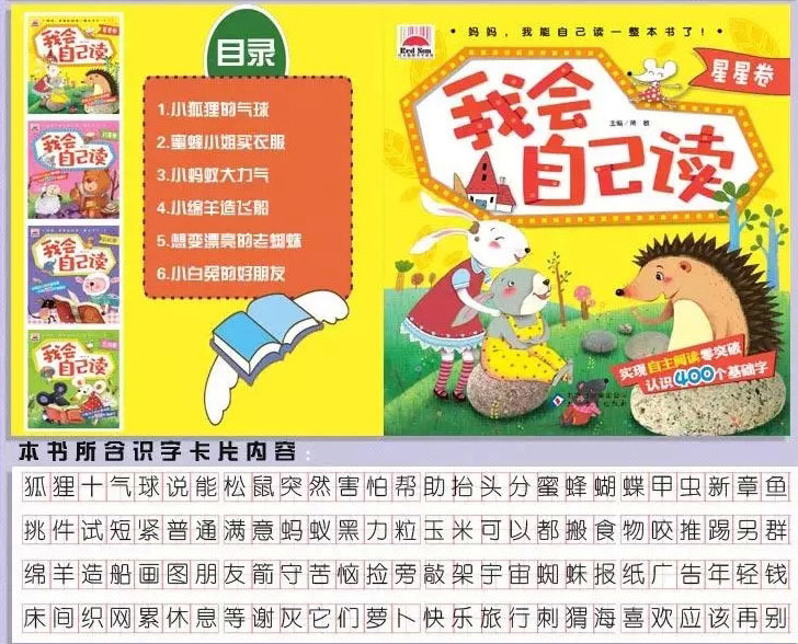 《我会自己读:星星卷》的故事轻松活泼,充满想象力,在培养孩子好习惯、情商方面能起到极有益的推动作用;故事语言简洁流畅、押韵上口,非常符合孩子的年龄特点,能够帮助孩子快速识字。这套书还在每个故事后面设置了两页识字卡片,把这个故事中的重点字总结罗列(可以剪下),便于孩子经常复习、加深记忆。