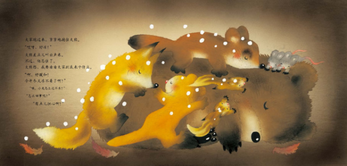 下雪了,该冬眠了,可是大熊怎么都睡不着。一会儿,有人偷偷走近大熊,大熊假装睡着了。听声音,来的是很小的动物,还不止一只呢。渐渐的,小老鼠、松鼠、果子狸、小兔子……大家陆陆续续都赶来了。原来,寒冷的冬天里,小动物们把大熊当成被窝了。突然,小动物们担忧起来:年年来找大熊当被窝,大熊一定会生气。可是大熊却想,原来整个冬天不是我一个人孤单单地睡在这里,有大家陪着我呢!
