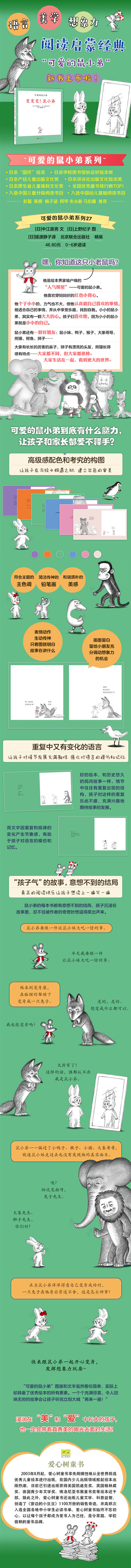 “可爱的鼠小弟”系列是日本绘本作家中江嘉男和上野纪子的不朽经典,自1974年问世以来就深受孩子们的喜爱,囊括了日本各大童书奖项,被誉为“世界绘本经典中的经典”。自2005年引进出版后,该系列长期位于儿童畅销书排行榜前列,销量累计超过1500万册,成为广受欢迎的儿童早期阅读启蒙读物。小小的、善良的鼠小弟成为了几代孩子难忘的童年伙伴。透过鼠小弟,孩子们看到真善美,并在感动中体验爱与被爱的快乐,人与人之间交往的真谛。
