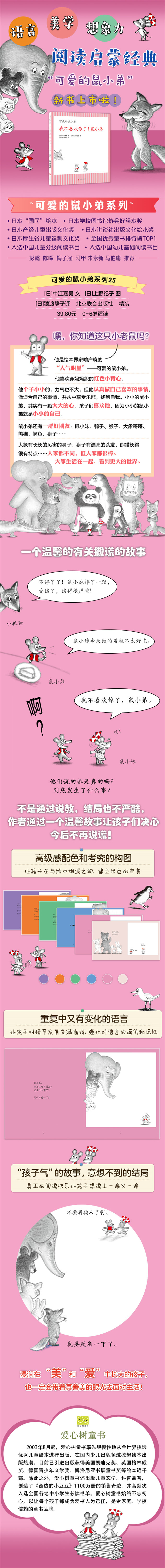 “可爱的鼠小弟”系列是日本绘本作家中江嘉男和上野纪子的不朽经典,自1974年问世以来就深受孩子们的喜爱,囊括了日本各大童书奖项,被誉为“世界绘本经典中的经典”。自2005年引进出版后,该系列长期位于儿童畅销书排行榜前列,销量累计超过1500万册,成为广受欢迎的儿童早期阅读启蒙读物。小小的、善良的鼠小弟成为了几代孩子难忘的童年伙伴。透过鼠小弟,孩子们看到真善美,并在感动中体验爱与被爱的快乐,人与人之间交往的真谛。