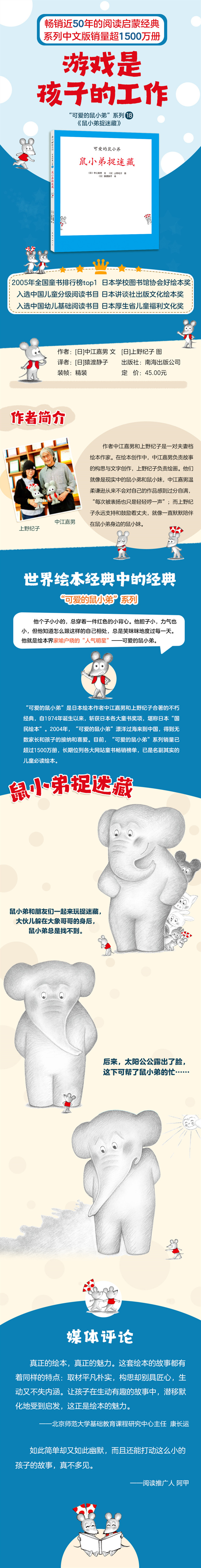 “可爱的鼠小弟”系列是日本绘本作者中江嘉男和上野纪子合著的不朽经典,自1974年诞生以来,斩获日本各大童书奖项——日本学校图书馆协会好绘本奖、日本产经儿童出版文化奖、日本讲谈社出版文化绘本奖、日本厚生省儿童福利文化奖,堪称日本“国民绘本”。