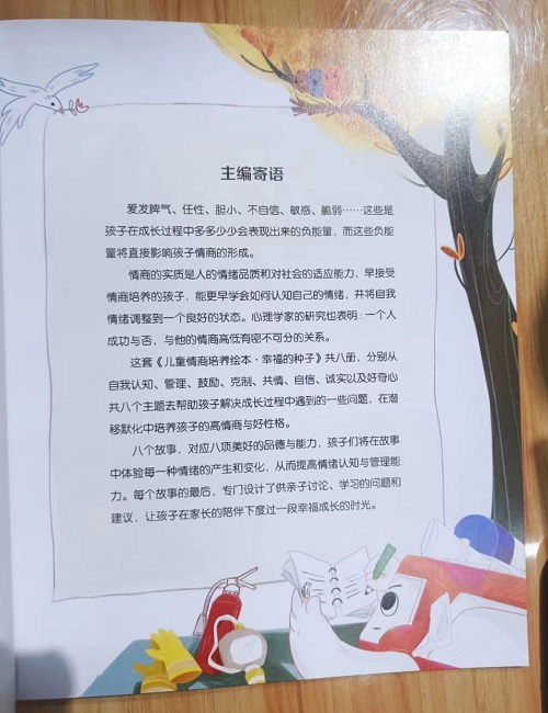 爱发牌气、任性、胆小、不自信、教感、脆弱…这些是 孩子在成长过程中多多少少会表现出来的负能量,而这些负能 量将直接影胸孩子情商的形或。 情商的实质是人的情绪品质和对社会的适应能力,早接受 情商培养的孩子,能更早学会如何认知自己的情绪。井将自我 情绪调整到一个良好的状态。心理学家的研究也表明:一个人 成功与否,与他的情商高低有密不可分的关系。 这套《儿童情商养绘本·幸福的种子》共八册,分别从 自我认知、管理、鼓励、克制、共情、自信、诚实以及好奇心 共八个主题去帮助孩子解决成长过程中遇到的一些问题,在潜 移默化中培养孩子的高情商与好性格。 八个故事,对应八项美好的品微与能力。孩子们将在故事 中体验每一种情结的产生和变化,从而提高情络认知与管理能 力。每个故事的最后,专门设计了供亲子讨论、学习的问题和 建议,让孩子在家长的陪伴下度过一段幸福成长的时光。
