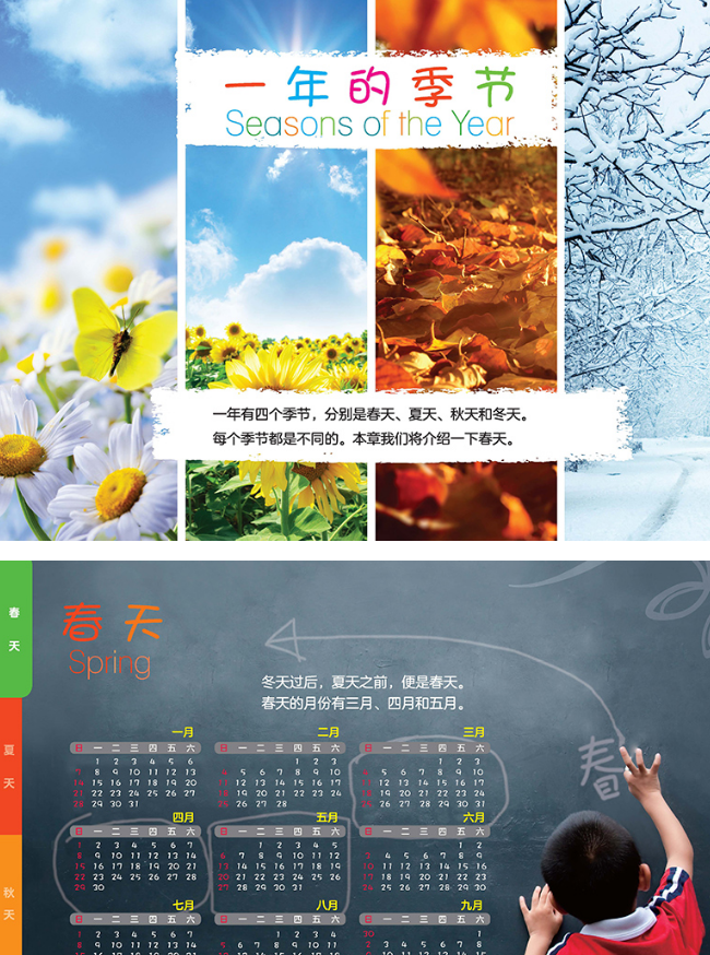 本书是低幼启蒙类的四季启蒙认知小百科。书中通过真实的图片场景、简单的文字描述和真实的照片,从季节特征、日常生活、注意事项、饮食习惯等多个角度将春夏秋冬展现在了我们眼前。是一套有助于小朋友们们启蒙认知的简单的科普绘本。