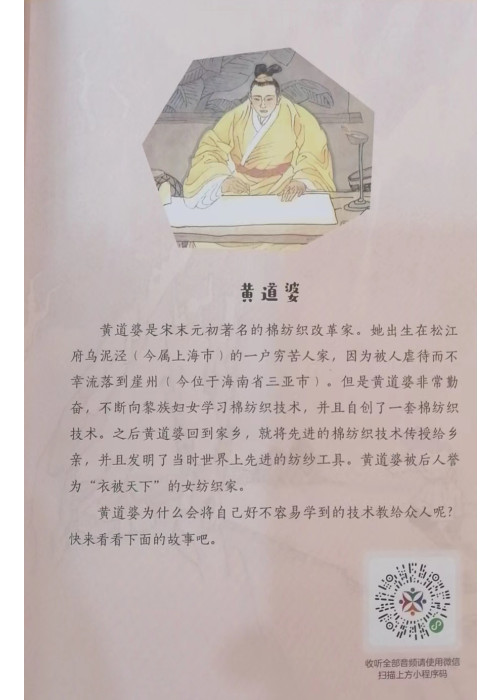 黄道婆(1245 ~ 1330年),又名黄婆或黄母,松江府乌泥泾镇(今上海市徐汇区华泾镇)人。宋末元初著名的棉纺织家、技术改革家。由于传授先进的纺织技术以及推广先进的纺织工具,而受到百姓的敬仰。在清代的时候,被尊为布业的始祖。 黄道婆出身贫苦,少年受封建家庭压迫流落崖州(今海南岛),以道观为家,劳动、生活在黎族姐妹中,并师从黎族人学会运用制棉工具和织崖州被的方法。
