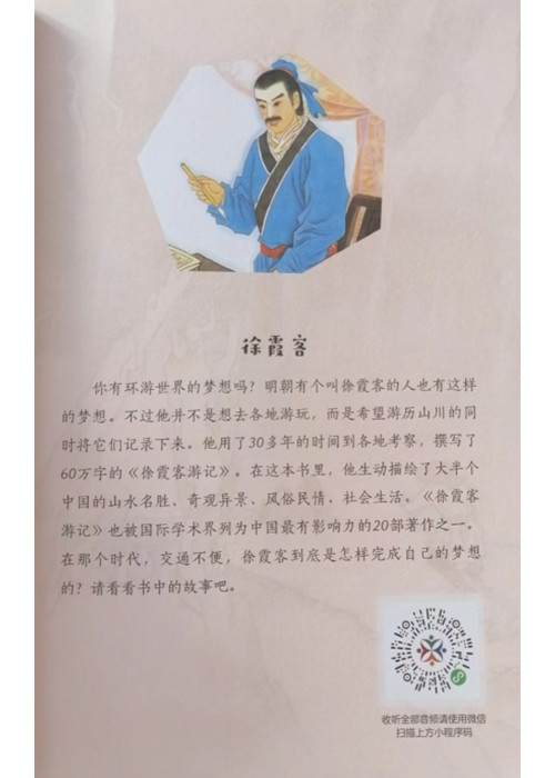 你有环游世界的梦想吗?明朝有个叫徐霞客的人也有这样的梦想。不过他并不是想去各地游玩,而是希望游历山川的同时将它们记录下来。他用了30多年的时间到各地考察,撰写了60万字的《徐霞客游记》。在这本书里,他生动描绘了大半个中国 的山水名胜、奇观异景、风俗民情、社会生活。《徐霞客游记》也被国际学术界列为中国最有影响力的20部著作之一。