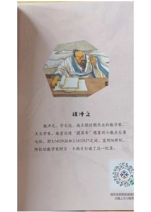 祖冲之,字文远,南北朝时期杰出的数学家、天文学家。他首次将“圆周率”精算到小数点后第七位,即3.1415926和3.1415927之间。直到16世纪,阿拉伯数学家阿尔.卡西才打破了这一纪录。