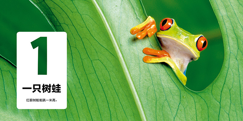每张跨页上都有一张动物的大幅照片,在一侧的小方框里留白的地方标出数字,配以动物名称和它的特别之处(例如:红眼树蛙能跳一米高)。