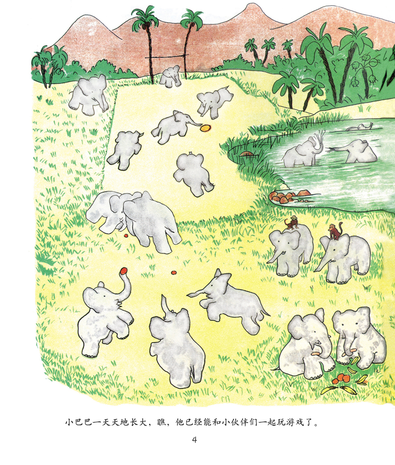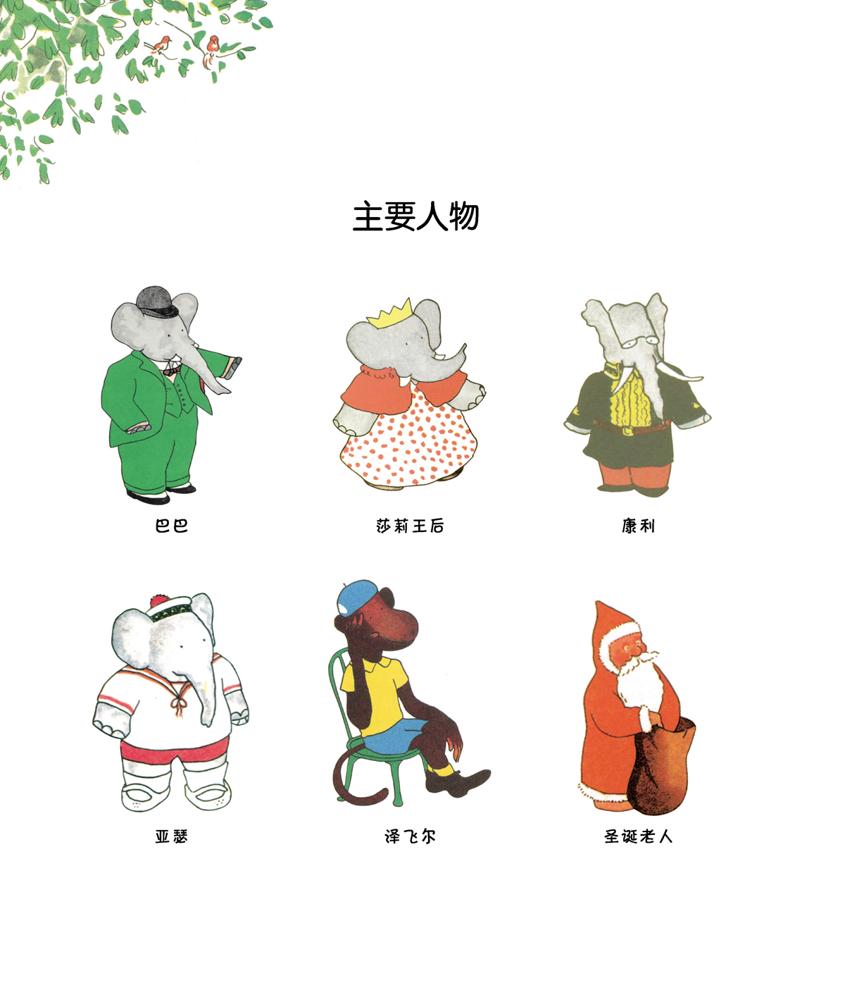 《大象巴巴故事全集》插图主要由鲜艳的红色、绿色和黄色构成。布吕诺夫用简练通俗的语言,为孩子们创造了一个天马行空的世界,更为可贵的是,这个世界充满了爱——巴巴对孩子们的爱,老妇人对巴巴的爱,小猴子对朋友的爱,圣诞老人对小矮人的爱……