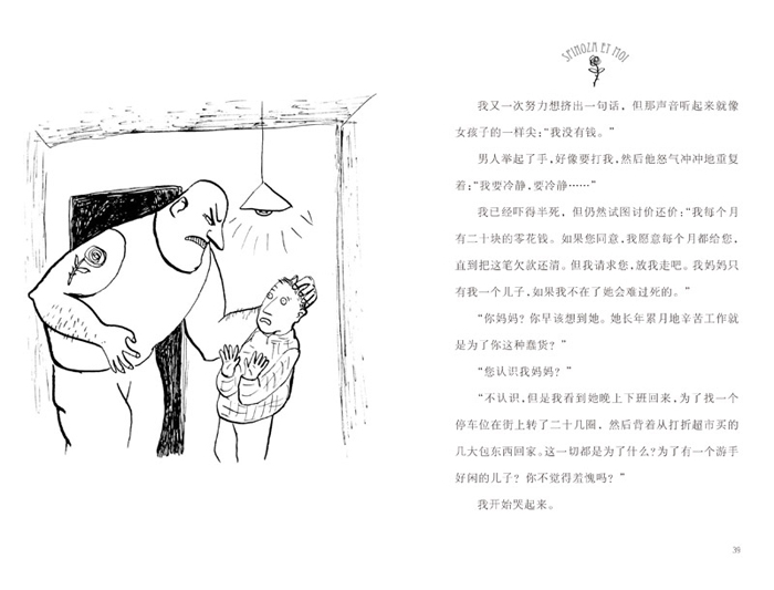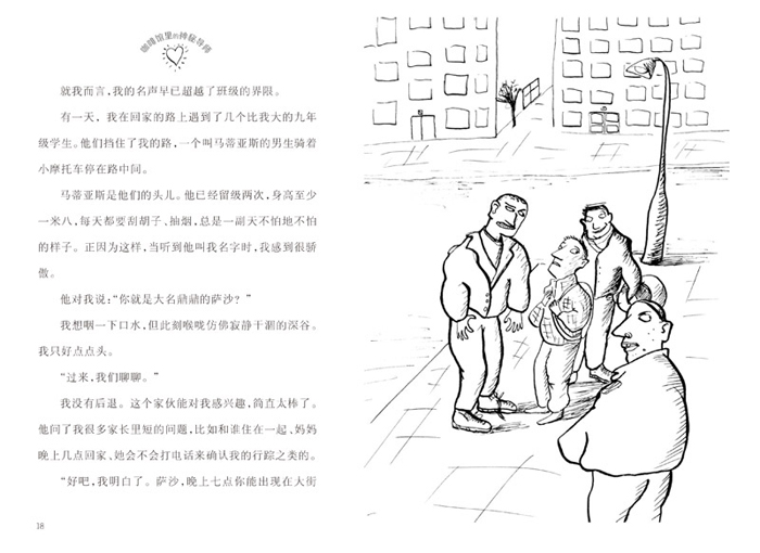 第二章 马蒂亚斯的建议 我像只兔子一样仓皇逃跑,飞快地蹿上一级级台阶,忙不迭地打开家门上的三道锁后,一下子瘫倒在门厅里。 我正大口喘着气,电话铃突然响起。 “你好?” “你好呀,我的萨沙,我是外婆。你还好吗,亲爱的?你正在吃东西,还是在做功课?” 我的外婆可真慈祥。学校里的混混儿头子才邀请我加入他们,我又刚从街上的“连环杀手”手中逃脱,此刻,她竟然问我下午茶吃的是巧克力爆米花还是小蛋糕。当然,这是因为她什么都不知道。 “我在做功课,外婆。我要勤奋刻苦才能得到您的祝贺。” 有了这句话,我敢肯定她会放过我,因为这是她希望听到的。然而,我自己也很喜欢这种被信任的感觉。其实我很希望外婆能听出我的弦外之音,但她没有…… “太好了,我的乖孩子,那我就不多说了。记得跟你妈妈说我打过电话来。” “好的,外婆,吻您。再见。” 挂了电话,我拿出一盒巧克力派和一瓶可乐,走进了卧室。我躺在床上,听着音箱里传出的音乐。 这是一段说唱音乐,当把声音开得很大时,低音代替了我的心跳,有人吼出了我的愤怒,自我仿佛不存在了一般,我变成了自己的旁观者。 我就这样躺了几个小时,但还是没能使气泡重回中点。