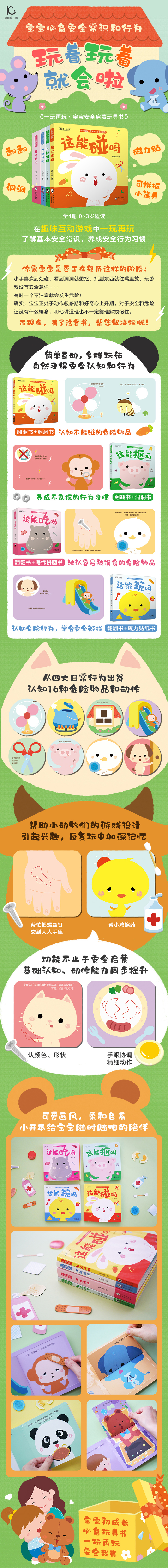 《这能碰吗》针对宝宝喜欢到处碰的行为特点,将外形上容易混淆的安全物品和危险物品以对比的形式出现,包括电扇、水蒸气、碎玻璃、剪刀,让宝宝在翻翻和抠洞洞的游戏中观察比较,通过小动物们的故事认知危险物品的特点和伤害性,了解基本安全常识。 《这能抠吗》针对宝宝喜欢抠洞洞的行为特点,呈现宝宝日常喜欢抠的危险位置或物品,如鼻孔、插座、螺丝母、肚脐眼儿,让宝宝通过翻翻和抠洞洞的游戏、小动物们的故事,认知不可以抠的物品及其原因,从而再反复玩书中提高安全意识,养成安全行为习惯。 《这能吃吗》针对宝宝喜欢随地捡东西吃的行为,呈现容易被宝宝误食的物品,如纽扣、瓶盖、桃核儿、螺丝钉,让宝宝通过5个可抠取、可拼按的安全棉小道具进行帮小动物们找食物的游戏,在反复地对应寻找过程中,既加深安全常识的印象也发展形状、颜色认知。 《这能玩吗》针对宝宝日常户内、户外活动经常出现的危险游戏行为,如踩椅子、玩门、倒着爬滑梯、向上抛沙子,让宝宝来当小医生,通过5个磁力贴进行帮小动物们治疗伤口的游戏,在反复操作的过程中不知不觉掌握安全游戏的规则,习得安全游戏行为。