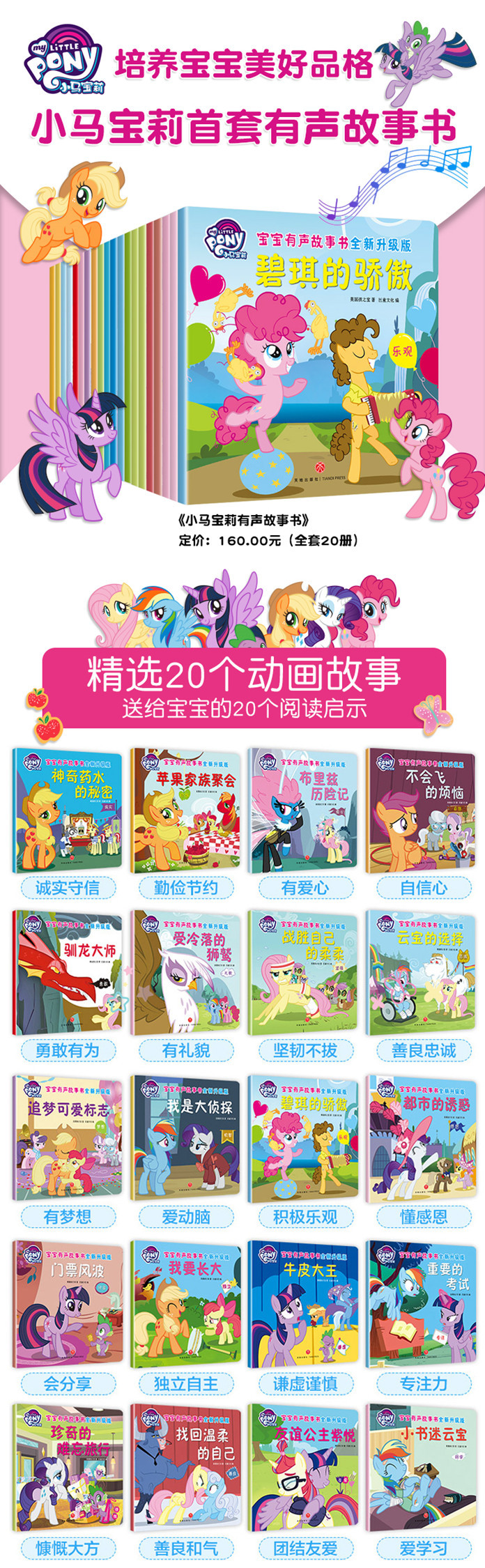 这是一套既能看又能听的有声故事书,选取了《小马宝莉》中10个分别体现机智、礼貌、勇敢、梦想、自信、诚实等品格的故事进行改编,包括《我是大侦探》《受冷落的狮鹫》《驯龙大师》《不会飞的烦恼》等。每个故事单独为一册,提炼其中的教育意义,让孩子的品格在阅读中获得提升。