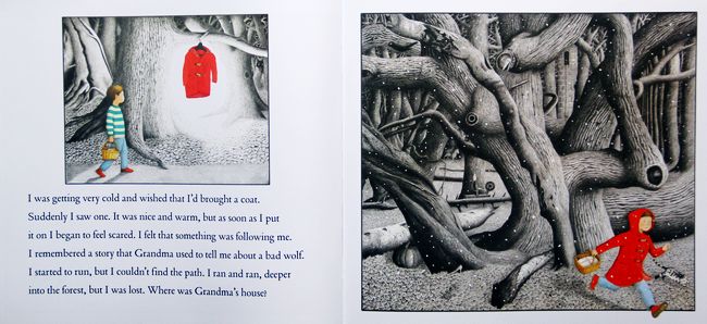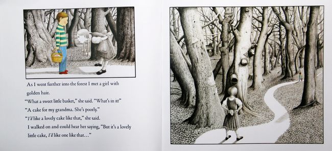安东尼布朗在本书中集结了许多童话故事角色,巧妙地安插在森林场景里,像是牵着牛打算和其他人交换物品的杰克、骄纵的金发小女孩和被继母狠心抛弃的两兄妹…… 刻意在画面中偷偷藏了个童话故事角色,等待读者慧眼识破,既具笑果更丰富故事情节。