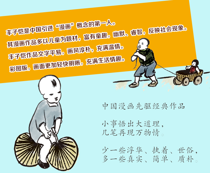 《丰子恺儿童漫画集》收录了丰子恺先生漫画作品中贴近儿童生活的、趣味性较浓厚的、适合儿童阅读的漫画作品200幅,并对原作的黑白图重新进行了电脑着色,以彩图版的形式呈现在读者的面前,风格简易朴实,意境隽永含蓄。