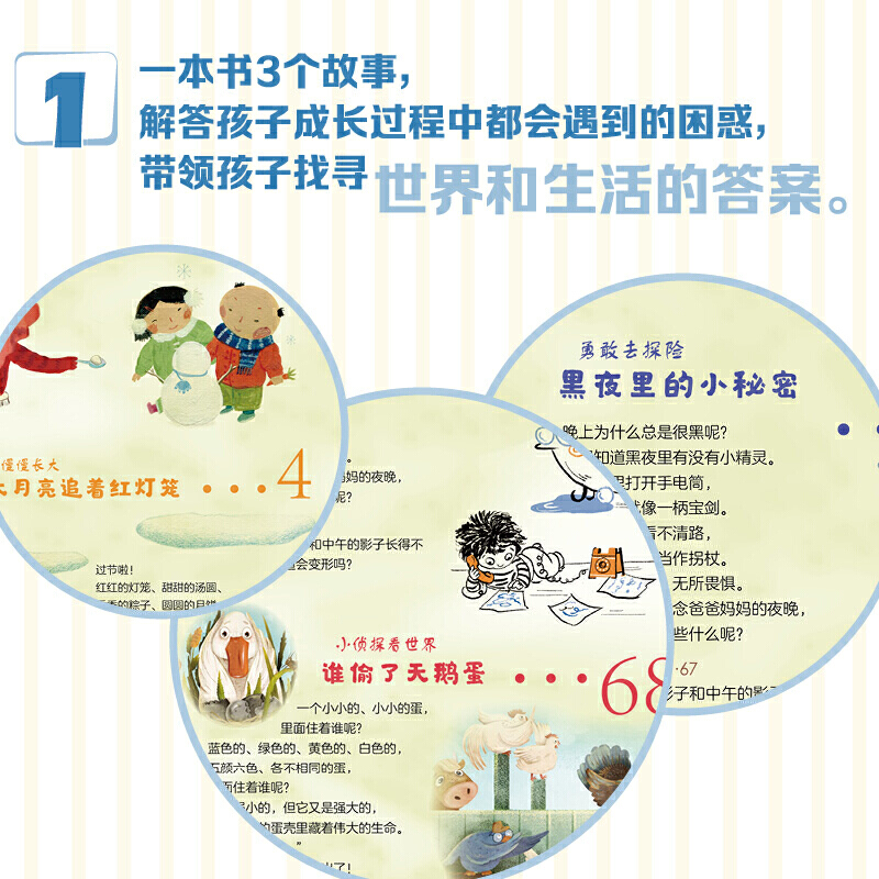 本书围绕着3个孩子们成长过程中都会碰到的小问题,通过有趣的小故事帮助孩子解答疑惑。 《黑夜里的小秘密》 黑暗里有什么?怕黑睡不着怎么办?看小主人公是如何战胜恐惧,和黑暗做朋友的。 《大月亮追着红灯笼》 每个节日都有什么意义?能不能每天都过节?画给孩子的精彩中国节,传承记忆深处流淌的脉脉亲情。 《谁偷了天鹅蛋?》 一个你想不到的关于诚实、关于观察力的神奇故事。走进动物们奇思妙想的神奇世界。 3个故事精彩纷呈,穿梭在奇幻的童话世界中,让孩子边看故事边学知识吧。