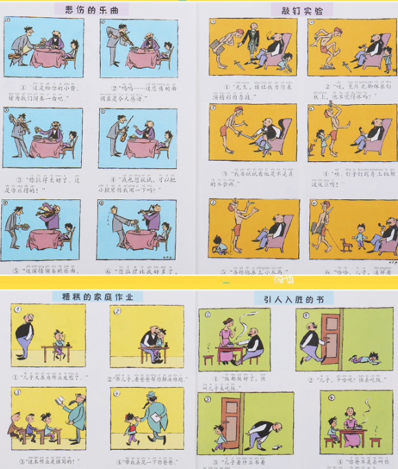 《父与子》无需什么解释,谁都读得懂;孩子们看了好笑,成人看了也好笑,各人去笑各人所理解的。这就是卜劳恩《父与子》漫画的魅力。