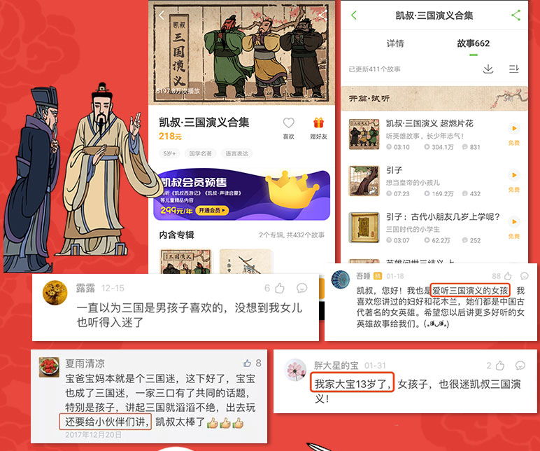 宝爸宝妈本就是三国迷,这下好了,孩子也成了三国迷,一家三口有了共同的话题,特别是孩子,讲起三国就滔滔不绝,出去玩还要给小伙伴们讲,凯叔太棒了。