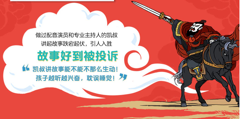2.凯叔给孩子倾心打造,孩子喜欢看也看得懂的三国演义。用剧本创作的方式,借鉴电影语言叙事方式,让所有故事里的英雄鲜活起来,在孩子心中留下深刻的印记。偏执打磨成就优质内容,历时颇久,字斟句酌,参考文史资料,文字版本修改30余版,音频修改10余版。