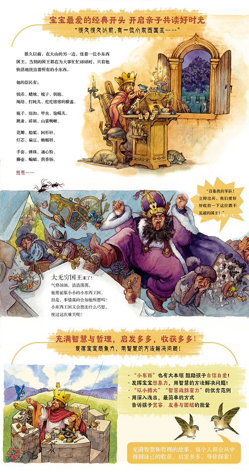 很久很久以前,在一个遥远的国度,小东西国王快乐地统治着从纽扣到甲虫,从弹球到通心粉——世上的一切小东西。当大无穷国王攻城略池、称王称帝之际,他愤怒地发现还有个小东西国王没归顺于他。“谁都知道小东西天生就是为大东西服务的。”他说。你支持大无穷国王的做法吗?大无穷国王能战胜小东西国王吗?这场战争到底会多有趣呢?你看了就知道!