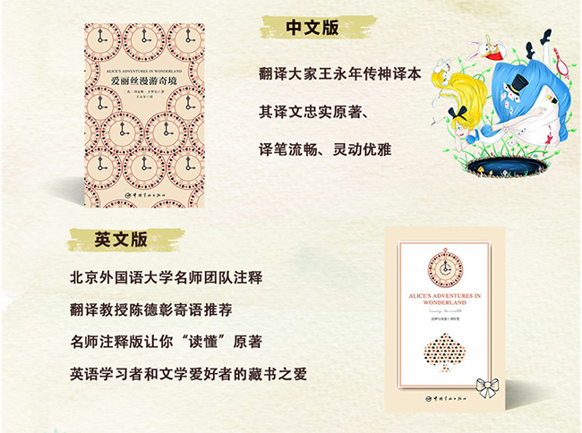 《爱丽丝漫游奇境》是十九世纪英国作家兼牛津大学基督学院数学教师刘易斯·卡罗尔创作的著名儿童文学作品。故事讲述了一个名叫爱丽丝的英国小女孩为了追逐一只揣着怀表、会说话的兔子而不慎掉入了兔子洞,从而进入了一个神奇的国度并经历了一系列奇幻冒险的故事。