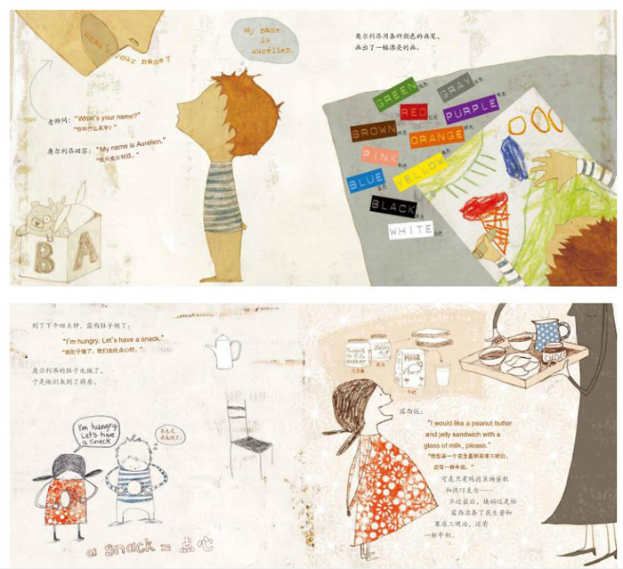 学习的目的是对它进行广泛的应用 并且尝试着优化我们的生活 英语学习也是如此。作为当今社会的国际通用语言之一 学好英语不仅可以帮助我们提升交流的机会 增加竞争力 同时也能够促进我们了解世界多元的文化 开阔眼界。 “我们一起说HELLO”是一套侵入式的情景英语故事绘本 它将英语与风趣幽默的故事恰到好处的结合 使陌生甚至有点“可怕”的英语变得好玩有趣 简单易懂。本系列包含了《老师说HELLO》 《我们表姐说HELLO》 《大家一起说HELLO》3册 故事从学校、家庭日常、旅行拜访三个主题展开 将日常交流中常用的词汇、短语和语句融入孩子们熟知的生活场景当中 通过与图像相结合的方式 帮助我们的小读者加深理解 同时在潜移默化中学会应用。总之 在父母的陪伴下 小读者们将在这里迎来一次新奇的体验 并让孩子知道 同时掌握多门语言原来可以如此有趣。 《老师说HELLO》 在《老师说HELLO》这本书中 主人公奥尔利昂要去学校学习英语了 这一天要从一句伟大的问候——HELLO开始!文中的对话保留了原始的英文部分 小读者们将会在父母的陪伴下 学到关于天气、色彩、时间、饮食的词语和短句。同时还会陪主人公一起来到学校 发现上学的乐趣 懂得交往的礼仪。