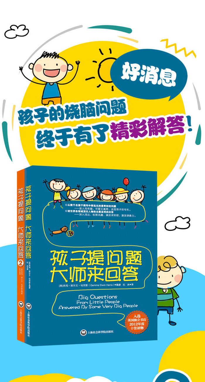 ★孩子们问的问题总是很简单,很基本,但他们对答案“打破砂锅问到底”的探求精神总是不经意地带有深刻的哲学意义。 ——《新京报》 ★125位名人专家组成的作者团队,他们时而幽默搞笑、时而聪明睿智,回答小屁孩们的各种问题,包括阿兰·德波顿、小说家珍奈特·温特森等。让你捧腹大笑的妙问妙答…… ——《新闻晨报》 ★10所英国小学上千名4-12岁的孩子提交了他们*想得到回答的问题,编者选取其中的100多个问题。答问的有很多都是国际知名的学者,如语言学家诺姆·乔姆斯基、生物学家理查德·道金斯、哲学家阿兰·德波顿。 ——生活·读书·新知三联出品《新知》