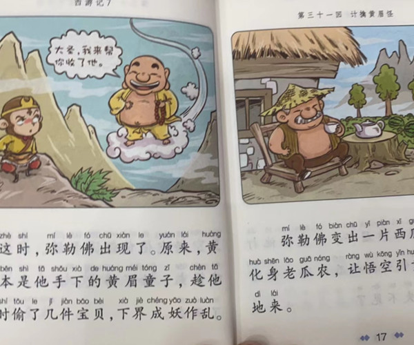 这是一套专为孩子设计的漫画版西游记。图书在保留原著《西游记》章回体结构的同时,兼顾原著主体脉络,通过每页一幅漫画加一段文字的形式,呈现名著中的精彩故事,帮助孩子轻松地理解名著内容,培养孩子对古典名著的兴趣,打下文学学习的基础。其漫画形象生动有趣,场景丰富活泼,文字轻松易读,大号字体且加注拼音,既能亲子阅读又能帮助孩子进行自主阅读。同时开本小巧,便于读者携带,能让孩子随时随地轻松阅读名著《西游记》。