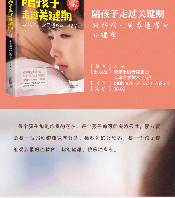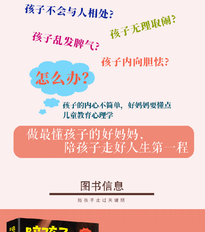编辑推荐 从出生到读完小学6年级,是孩子人格、智力、行为方式等形成的关键时期。倘若父母能在此时给予正确的指引和培养,孩子的能力和素质都能得到迅速提升,为今后的成长打好基础;反之,若错过了这个关键期,即便花费数倍的努力也难以弥补。 很多家长只知道其重要性,却不谙教养之道。虽然用心良苦、付出颇多,结果却与初衷大相径庭。根本原因,就在于没有真正走进孩子的内心。教育是一门“动心”的艺术,孩子的所思所想,其实早就体现在他的语言和行动中了,父母若不学点儿童教育心理学,就无法解决面对的教育难题。 本书有场景再现,有科学分析,能帮家长轻松解读孩子的心理状态,合理疏导孩子的情绪,找出问题的实质,找到解决办法,让孩子在家长的陪伴和教导下一步步走向优秀。 内容简介 本书旨在帮助妈妈了解最基本的教育学、心理学知识,掌握科学的教育方法和技巧,用心理学的规律去雕琢孩子,培养出真...