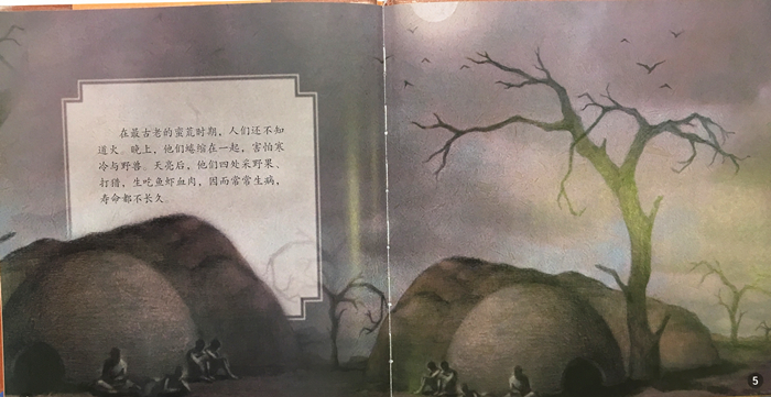一个聪明的年轻人受到伏羲的嘱托,来到燧明国寻找火种。当他看到鸟啄燧木吃虫的景象时,受到启发,发明出钻木取火的方法,让人们远离黑暗,享受到了光明和温暖。这位年轻人就是后来受到众人敬仰的“燧人氏”。