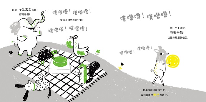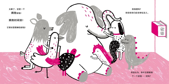 4、本书具有超强的互动性,鼓励孩子在阅读的过程中做出各种动作,包括拍手、唱歌、吐舌头、弹跳、拥抱等,非常适合亲子阅读和集体阅读