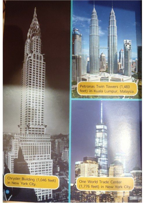 摩天大楼的建筑材料: mortar,stone,brick,iron,steel,concrete,cement 影响摩天大楼建设的因素: elevator,gravity,light,temperature,wind, earthquake, energy, water 章天大楼的种类: skyscraper, supertall,megatall later on 后来 since then 从那时起 stand out 突出;引人注目 have to do with...与......有关 in a way 在某种程度上;在某一点上 back and forth 来回地;反复地 more and more 越来越多 protect against 使免受 in the middle of... 在......中间 because of 因为;由于 what 引导的表语从句,例如: Thats what they called the HomeInsurance Building in Chicago, Illinois, U.S.A. 动词的过去分词短语作时间状语,例如: Completed in 1930,it wonthe title of“World's Tallest Building.” as引导的时间状语从句,例如: As wind moves through theopenings, giant turbines inside the building turn to make energy.