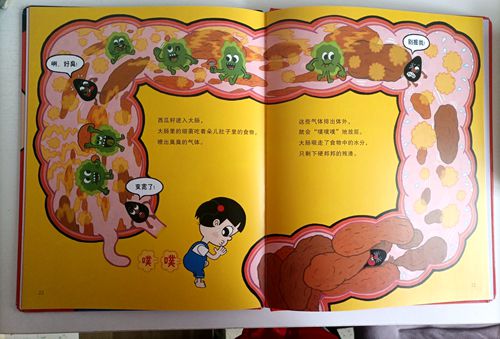 朵儿不小心把西瓜籽吃到了肚子里 她很害怕——肚皮长出西瓜藤 瓜籽也很害怕——肚子里一片漆黑啊 西瓜籽开始了它的旅行: 第一站 它到了又窄又深的食道里。 通过牙齿舌头唾液把食物搅匀水解送进喉咙里。食道的“蠕动功能”把它送往胃里。但是西瓜籽很特殊,外壳太硬又很光滑,基本不会和别的食物一起消化成碎末。 第二站 它到了宽敞的胃里。 胃负责把食物化成粥糊。胃液具有强酸性,溶解食物中的蛋白质,杀死细菌。 第三站 它进入了黄色苦水的十二指肠。 这里是小肠的开端。很快就会在小肠内晃来晃去。 第四站 它进入了狭窄弯曲毛茸茸的小肠。 小肠里的绒毛褶皱吸收食物中的养分,并将养分输送到全身,给骨骼肌肉提供营养。 第五站 它进入了大肠。 大肠吸收食物中残留的水分,将水份输送到全身。然后大肠内只剩下残渣(便便)。 第六站 跟大便一起在马桶里。 科学小驿站: 不能吃太多,不然需要消化的量就会增加,胃小肠大肠来不及消化,就会肚子疼。