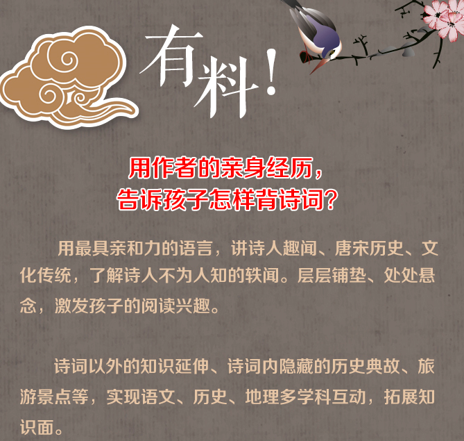 本书精选唐宋两朝三十位多位有名诗词人物,通过人物的生平故事轶闻典故,把每一位诗人毕生的作品做了一个梳理串联,使诗词和人物变得更鲜活。全书内容由人物生平、创作背景、历史典故、诗歌鉴赏、文化常识、相关有名景点六个版块组成。一首首貌似毫无关系的唐诗在作者笔下被串联起来,生动活泼有趣,引导孩子们探索蕴含在古诗文经典中的中华历史文化知识,扩充孩子们的知识面,激发创作灵感与思路。