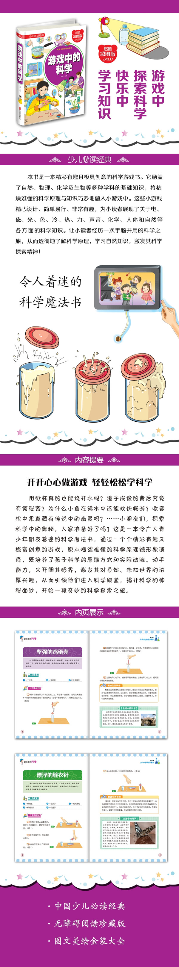这是一本精彩有趣且极具创意的科学实验游戏书。它涵盖了自然、物理、化学及生物等多种学科的基础知识,将枯燥难懂的科学原理与知识巧妙地融入小游戏中。这些小游戏精心设计、简单易行、非常有趣,为小读者展现了关于电、磁、光、色、冷、热、力、声音、化学、人体和自然等各方面的科学知识。让小读者经历一次手脑并用的科学之旅,从而透彻地了解科学原理,学习自然知识,激发其科学探索精神!