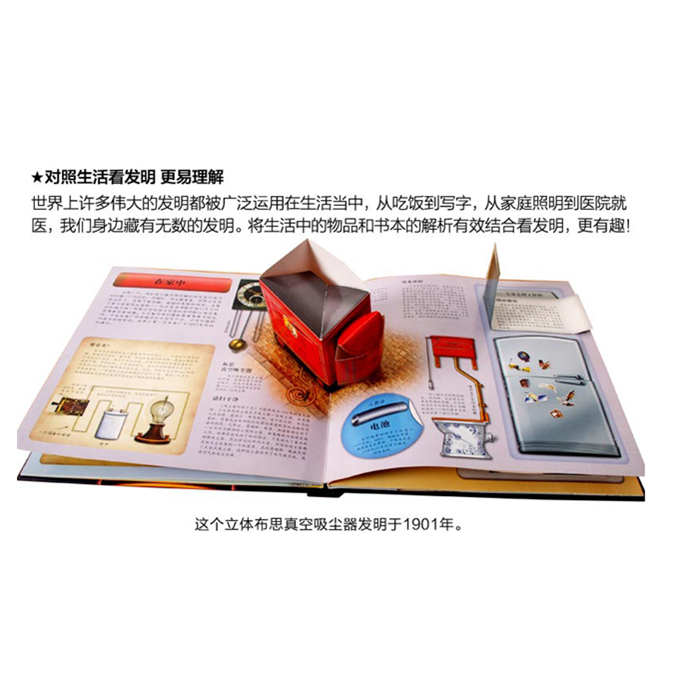 ★如果问孩子,是喜欢去博物馆了解人类伟大的发明还是愿意通过阅读来获取知识,孩子一定会说愿意去博物馆。因为在博物馆里,人类的伟大发明都以具体互动的形式为孩子展出。孩子可以通过触碰博物馆中的实物,更好的观察,了解各项发明内部的科学知识。而知识也正是因为这份互动而让孩子感受到学习的乐趣。因此,我们为让孩子在家中,在阅读过程中,能够与科学互动,能够拥有可以随时翻阅的“科学博物馆”。我们为孩子推荐这部引进自英国的经典互动立体科普书《改变世界的发明》。它以互动,立体的科普内容让孩子观察人类伟大的发明。奇妙的立体、翻翻、电影纸艺的设计让孩子触碰科学,了解丰富的知识